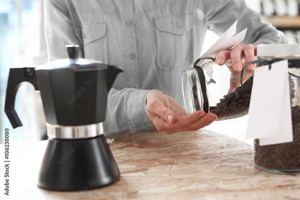 Kawa - Czajniczek do parzenia kawy.Kawiarnia , barista wybiera gatunek kawy do zaparzenia w kawiarce... #106230080