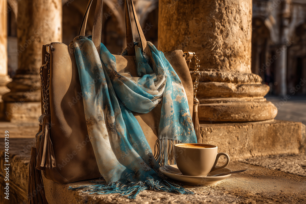 Kawa - Ponadczasowa taupe'owa torebka, szal w odcieniach turkusu i kawa na tle antycznej architektury.... #1774087159