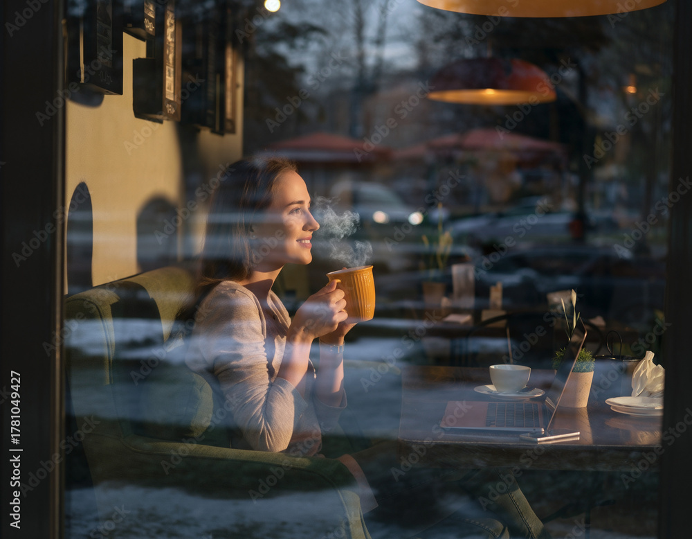 Kawa - Zadowolona, młoda kobieta trzyma w rękach kubek z gorącą kawą wyglądając przez okno #1781049427