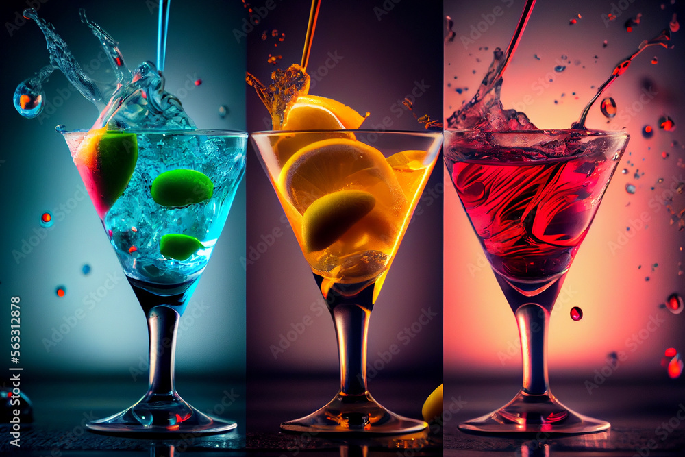 • Drei verschiedene Cocktails auf einer Theke in einer Bar mit lichter im Bokeh im Hintergrund - Generative Ai