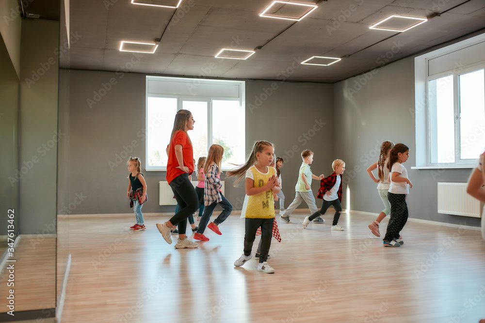 • Learning dance figures with teacher. Group of little boys and girls dancing while having choreography class in the dance studio. Female dance teacher and children