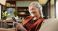• Old woman, phone and laugh on couch with texting, notification and funny chat in living room at house. Person, smartphone and happy with mobile app, contact and social network on sofa at apartment