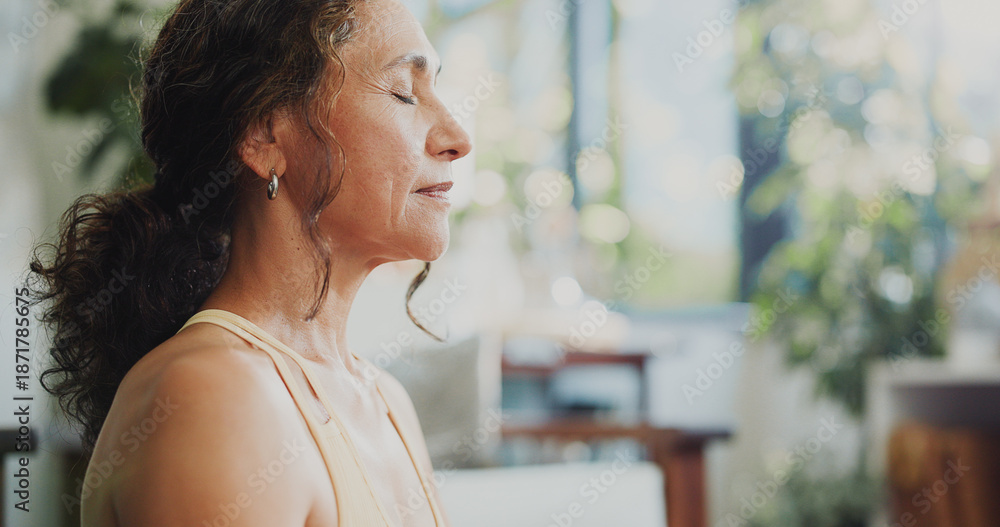 Sport - Calm woman, meditation and home with breathing exercise for spiritual wellness or health. Female... #1871785675