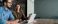 • Happy busy female manager explaining corporate software work talking to young male employee consulting client working on computer using laptop discussing business project plan at office meeting.