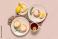 • Plates with delicious lemon tarts and cup of tea on beige background
