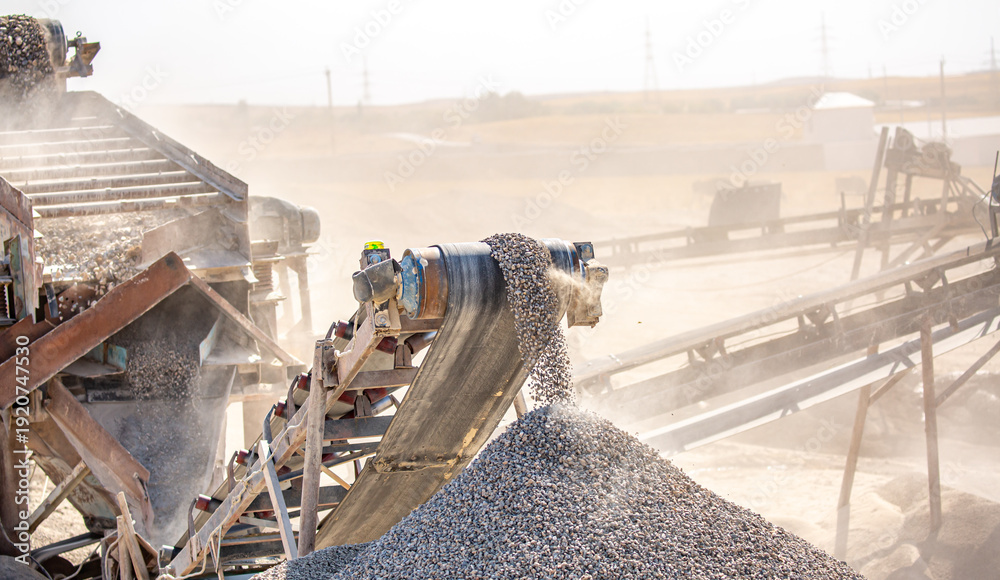 Sport - Vibrating screen stone crusher in operation. Crushing stones in a quarry for processing minerals,... #1920747530