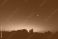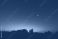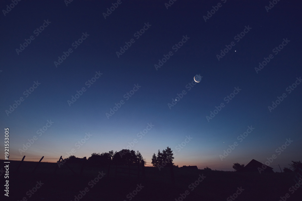 • Morning old Moon with stars, planets and rural countryside tree silhouettes.