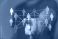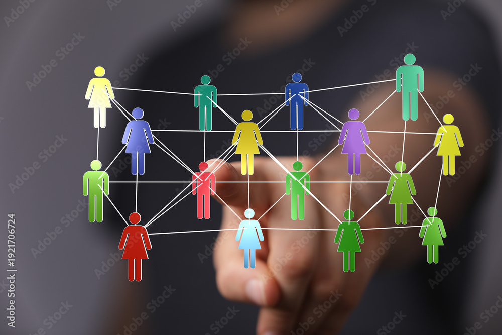 • Abstract network of interconnected people icons, representing social connections, teamwork, and business networking. Human interaction and comm