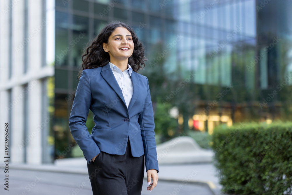 Sport - Confident young businesswoman smiling, walking outdoors with hand in pocket, against a backdrop... #1923955458