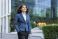 • Confident young businesswoman smiling, walking outdoors with hand in pocket, against a backdrop of modern glass office buildings, representing professional success and urban career