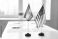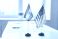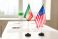 • Flags diplomacy meeting on table symbolize negotiations. Iran and United States flags at conference table; dialogue, agreement, conflict. Represents international relations and strategic negotiation.