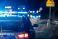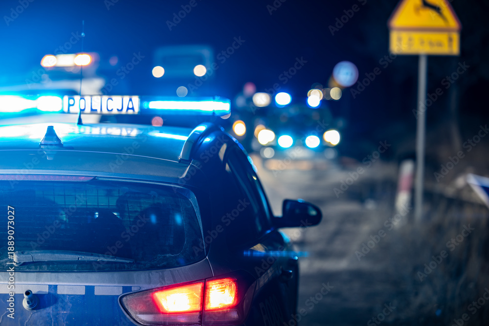 Auta - Policyjny radiowóz z reflektorem w nocy na ulicy #1889073027