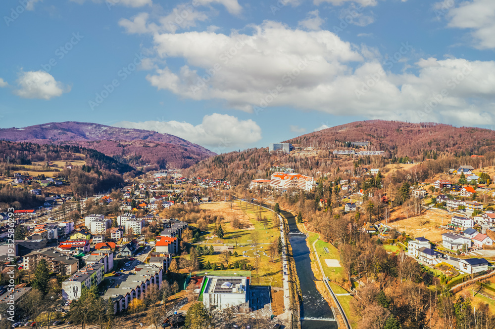 Auta - Wisła, miasto turystyczne w górach na Śląsku w Polsce, panorama zimą z lotu ptaka. #1932586293