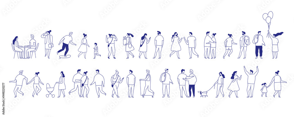 • Background stylized people silhouette line vector set isolated on white. People crowd. Men and women, kids walking outdoor. Contour, drawing, people, character