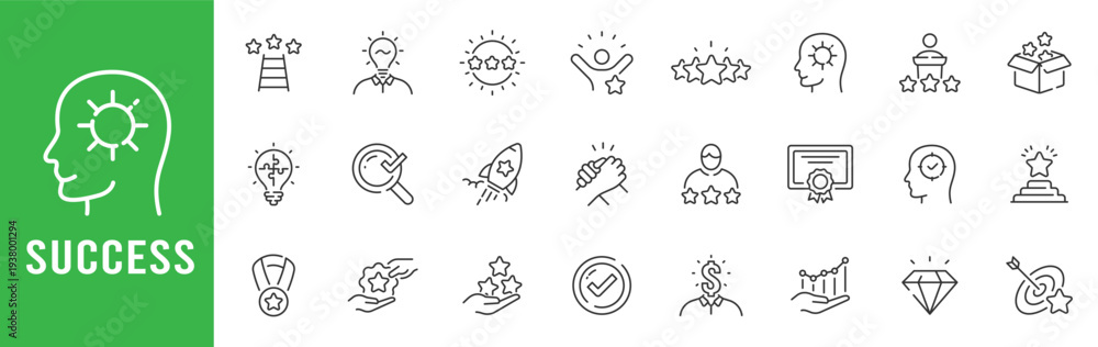 Kolej - Success achievement outline icons featuring rating stars, awards, trophy, rocket, target, growth,... #1938001294