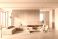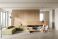 • Minimalist living room interior with wooden panel wall, modern furniture, large windows, soft neutral palette, serene atmosphere. 3D Rendering