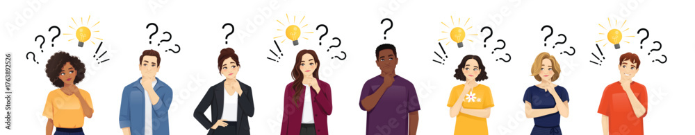 • Set of thoughtful people. Vector illustration of cartoon men and women thinking, planning, or pondering with question marks and light bulbs.