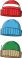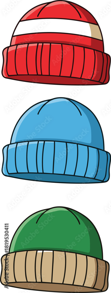 • Colorful knitted winter beanie hats with folded brims in cartoon style, featuring warm cozy designs ideal for cold weather fashion, seasonal apparel, and vector illustrations