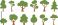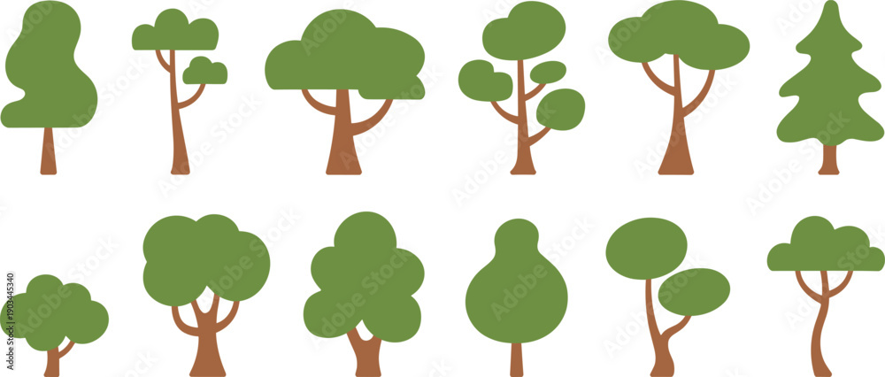 • Stylized flat green tree illustration set, minimal cartoon forest trees collection, modern nature foliage icons, isolated eco vector design