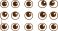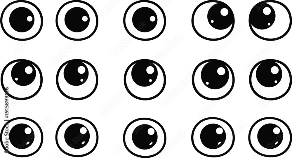 • Set of cute cartoon googly eye vector illustrations with various pupil positions and expressions isolated on white for character design and comic animation assets.