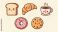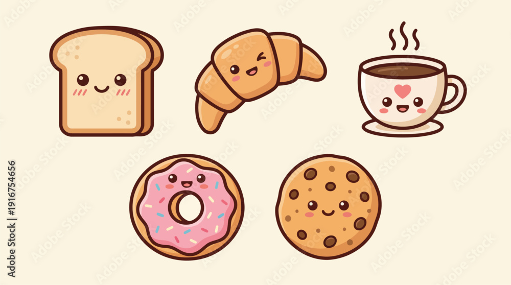 • Cute cartoon breakfast and snack items with happy faces, including toast, croissant, coffee, donut, and cookie.