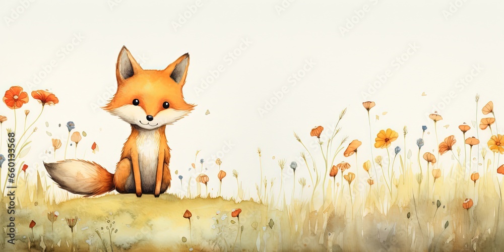Dla Dzieci - watercolor style cartoon illustration of red fox sitting in autumn grass field , isolated on... #660133568