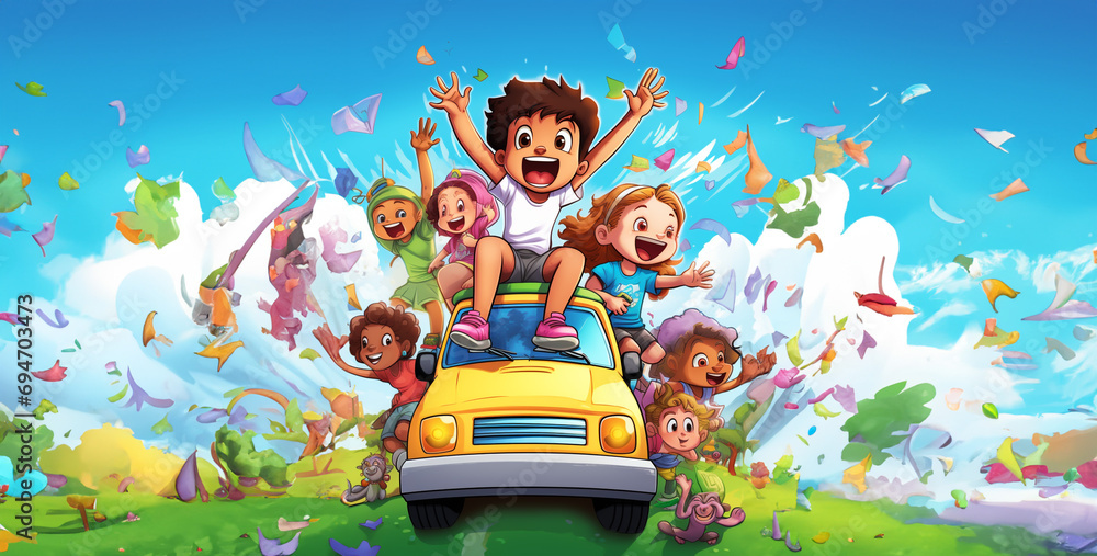 Dla Dzieci - child playing with toy airplane, child and butterfly, kids illustration cartoon style, kids... #694703473