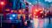 • Vibrant red fire truck with flashing blue and red emergency lights illuminated on wet city street at dusk, reflecting urgent urban response scene with blurred firefighter in background