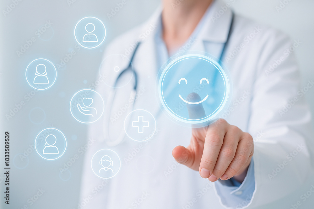 • AI generated medical interaction with doctor selecting smile icon on hologram ui representing patient satisfaction health service design and smart digital care system in modern ehealth environment