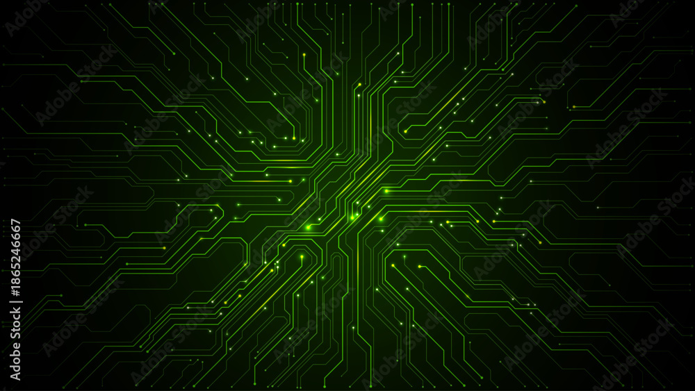 • Abstract green technology backdrop featuring detailed circuit patterns, semiconductor traces, and futuristic digital elements for innovative tech presentations. Digital vector illustration
