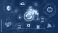 • Digital transformation concept with hand interacting with sync icon among technology symbols on modern digital interface background.