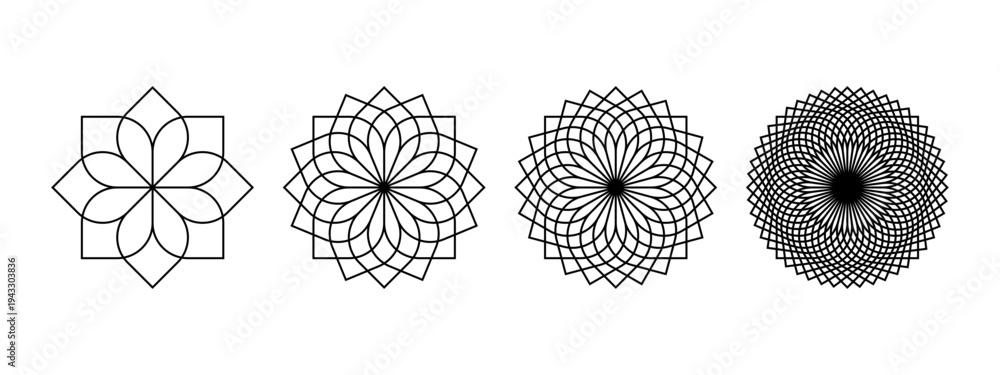 • Set of simple linear flower icons isolated on white background. Floral spirograph shapes. Lotus or chrysanthemum petals top view. Simple mandala elements. Vector graphic illustration.