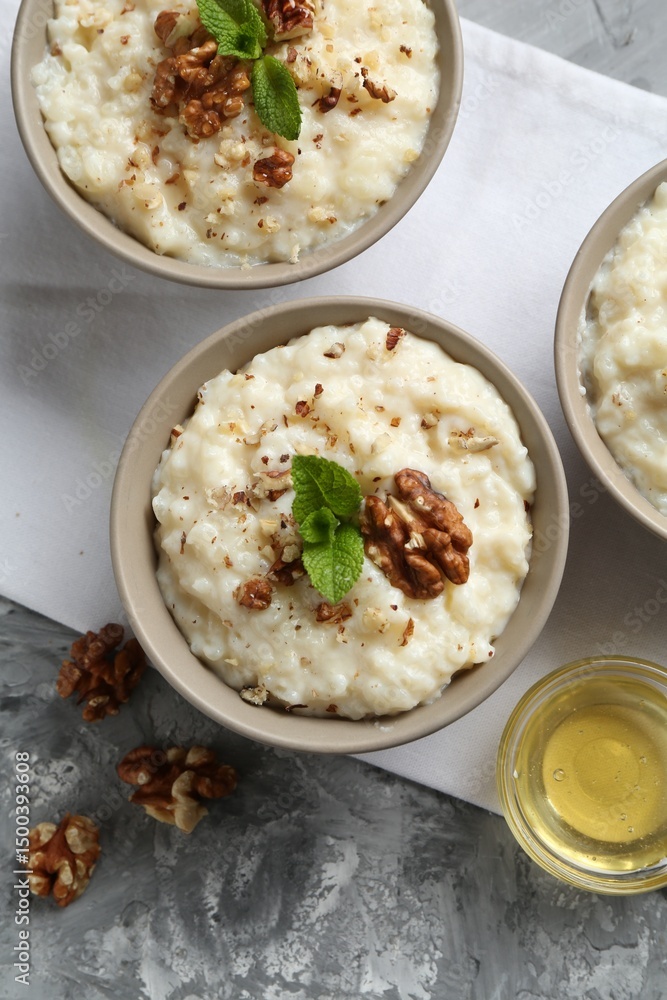 Pejzaż - Delicious rice pudding with walnuts, mint and honey on grey table, flat lay #1500393608