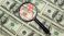 • Financial risk warning and Money risk alert - magnifying glass highlighting danger sign on US dollar bills. Economic risk or inflation