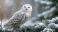 • A snowy owl sits on a branch, overlooking a tranquil winter scene filled with snow and green pine trees