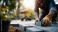 • Faceless landscaper man laying interlocking paving stones creating new backyard patio defocused garden background wearing protective gloves work clothes outdoor hardscaping