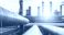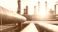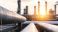 • Oil refinery plant pipelines transporting petroleum products with industrial structures under a bright sunset sky