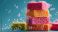 • Colorful sponges stacked on a bright background with soap bubbles for home cleaning tasks during the day