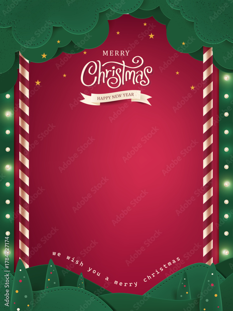 • vertical Christmas greeting card banner in paper cut style with tree, candy cane, light bulb, ribbon, snow, star, copy space, decoration, typography and festive holiday background template