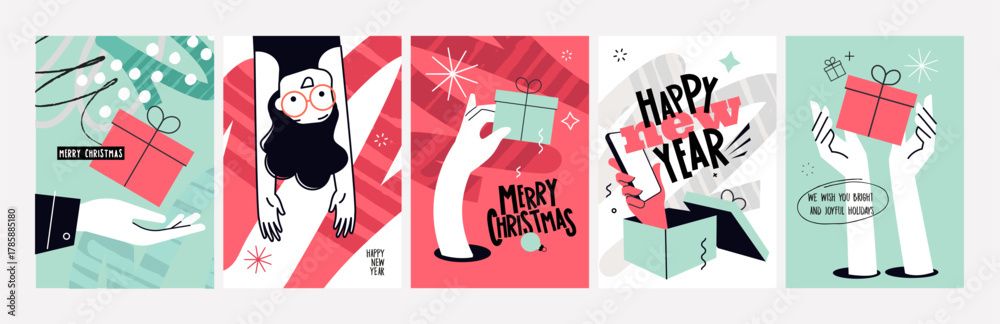 Christmas and New Year Greeting Cards. Fun vector illustrations for greeting card, party invitation card, website banner, social media banner, marketing material. od 0,00 zł Dopasuj i kup