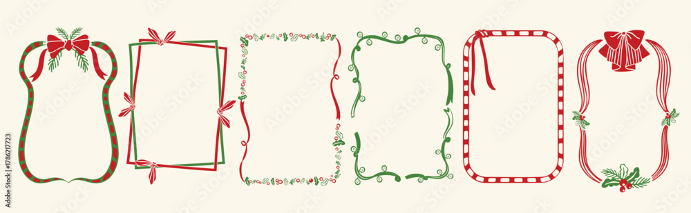 Christmas frame vector illustration set with red and green ribbons, bows, holly leaves and festive decorations — elegant holiday design for greeting cards, invitations, posters and packaging prints. od 0,00 zł Dopasuj i kup
