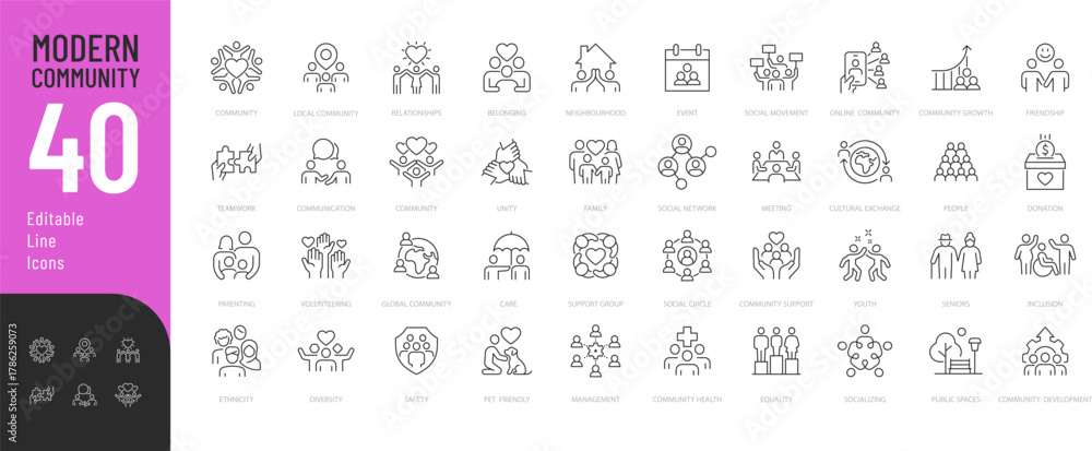 • Modern Community Line Editable Icons set. Vector illustration in modern thin style of people related icons: neighborhood, friendship, family, and more. Isolated on transparent background.