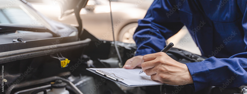 • Auto check up and car service shop concept. Mechanic writing job checklist to clipboard to estimate repair quotation to client at workshop garage.