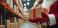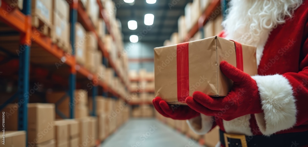 • Santa Claus stands in a warehouse full of boxes holding a gift. He is ready for holiday delivery and helping with online retail order distribution.