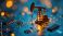 • Mini oil rig pumpjack rests on computer circuit board. Digital tech meets fossil fuel industry. Clean energy transition concept. Future power extraction.