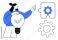 • Woman with light bulb symbolizing eco-ideas gestures towards interconnected gear puzzle piece. Ideal for innovation, teamwork, sustainability, problem solving, creativity, strategy, and progress