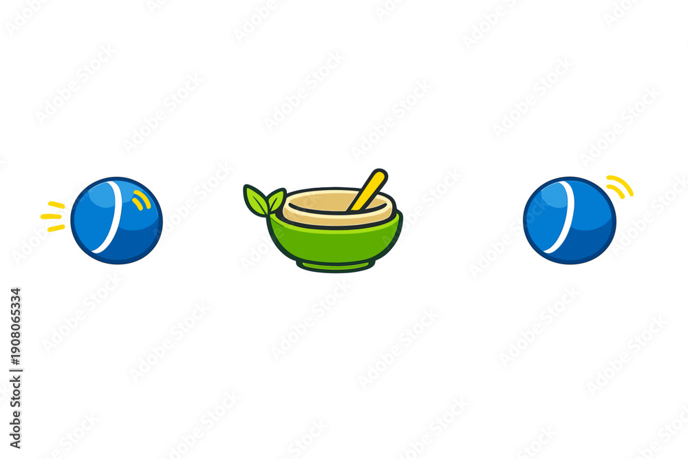 • Three cartoon icons featuring two blue balls with motion lines and a green bowl with a wooden spoon and leaves, all set against a solid black background with white outlines.