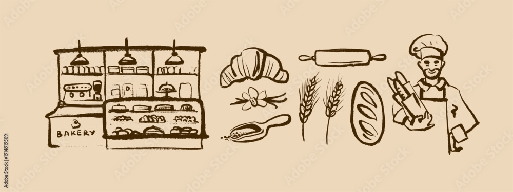 • Doodle baking set with chef, ingredients and tools in sketch style. Vintage culinary process, cozy kitchen, bakery branding. Hand drawn vector illustration