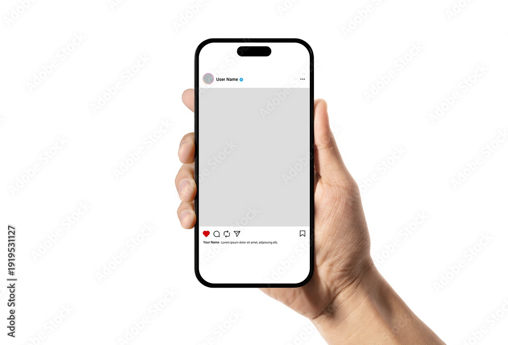 • Smartphone Social Media Post Mockup, Hand Holding phone with Blank instagram ui ux mock up Template on Transparent Background