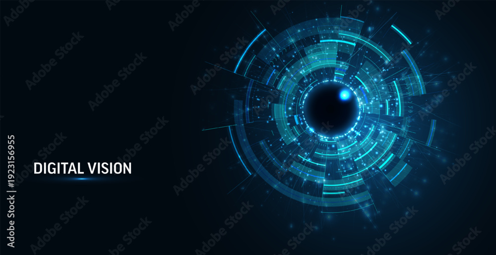 • Abstract digital eye. Computer vision AI concept, big data visualization, neural network technology. Futuristic biometric background for cybersecurity, innovation. High-tech design vector illustration